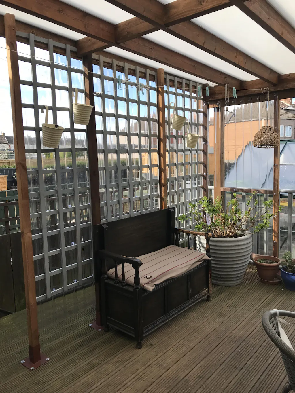 Although this is meant for roofing we already have a Polly carbonate roof over our decking and corrugated sheets have made a perfect windbreak on the western side and will also keep out the rain, allowing us to sit outside more often.